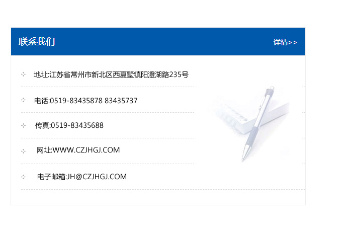 地址:常州市新北區友邦商務大廈1幢16、17層  電話:0519-85101652  傳真:0519-85112595  郵編:213022  網址:www_cz-jiayue_cn.7australia.com  郵箱:xiajifengaa@163.com
